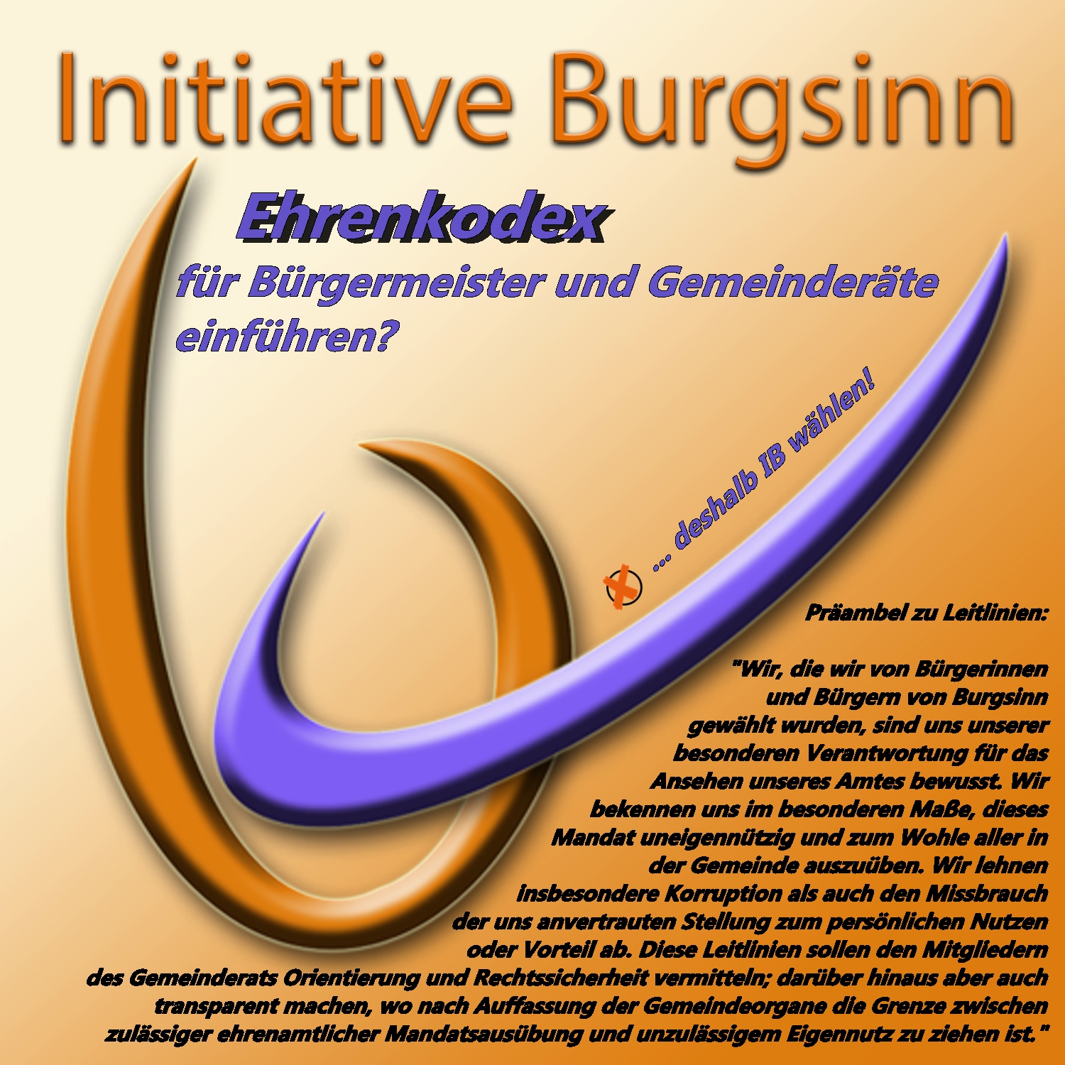 "Wir, die wir von Bürgerinnen und Bürgern von Burgsinn gewählt wurden, sind uns unserer besonderen Verantwortung für das Amt bewusst. Wir bekennen uns im besonderen Maße, dieses Mandat uneigennützig und zum Wohle aller in der Gemeinde auszuüben. Wir lehnen insbesondere Korruption als auch den Missbrauch der uns anvertrauten Stellung zum persönlichen Nutzen und Vorteil ab. Diese Leitlinien sollen den Mitgliedern des Gemeinderats Orientierung und Rechtssicherheit vermitteln; darüber hinaus aber auch transparent machen, wo nach Auffassung der Gemeindeorgane die Grenze zwischen zulässiger ehrenamtlicher Mandatsausübung und unzulässigem Eigennutz zu ziehen ist."